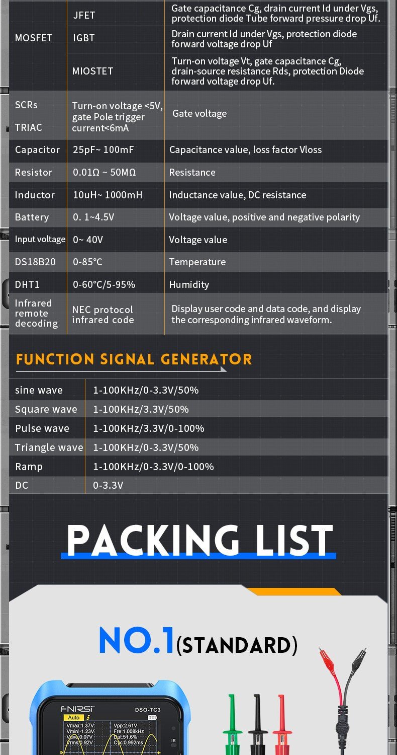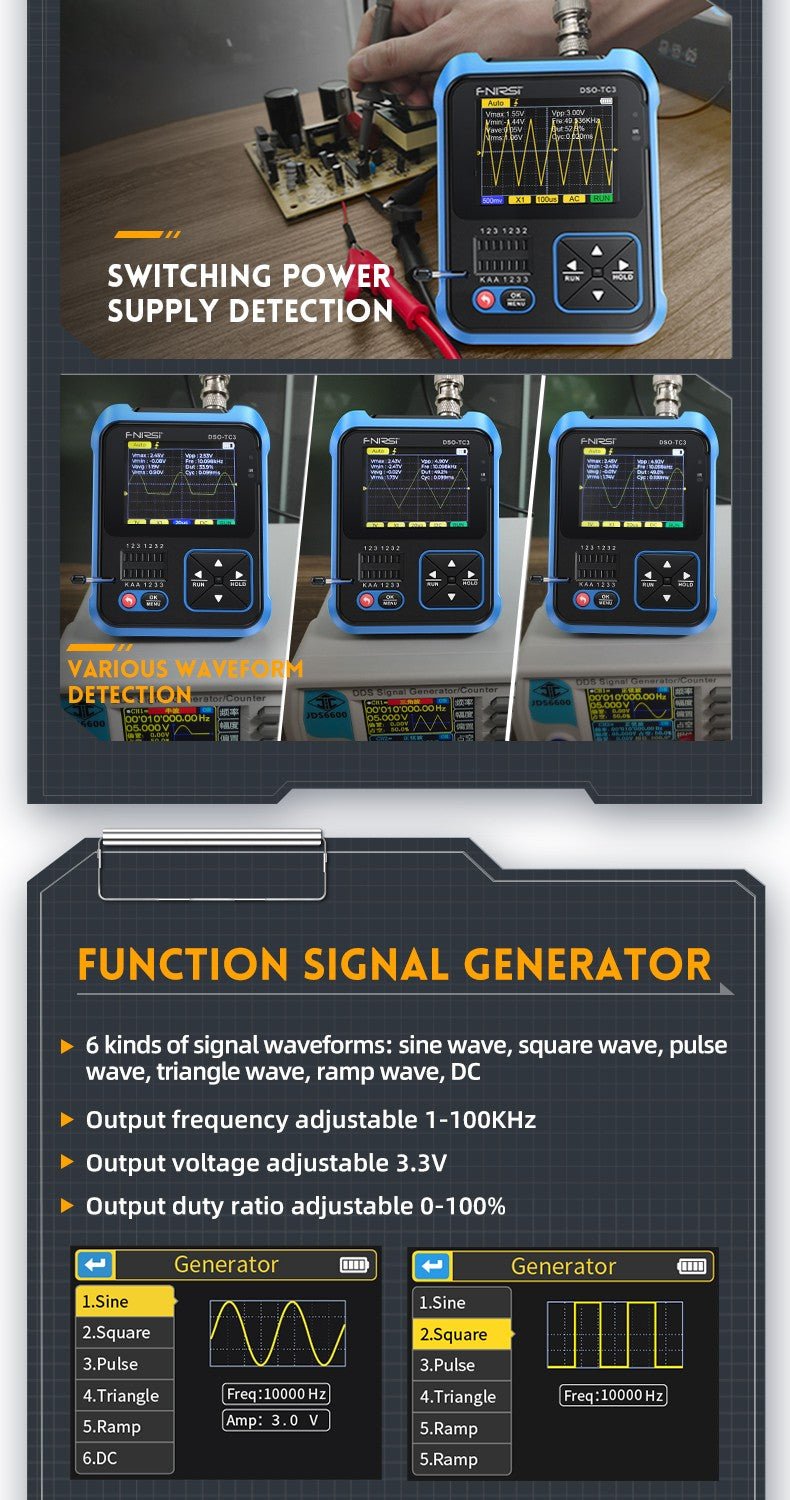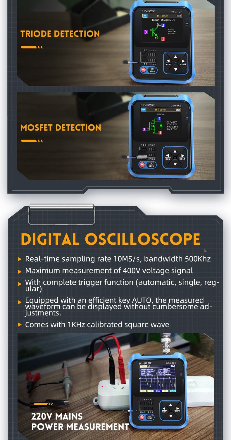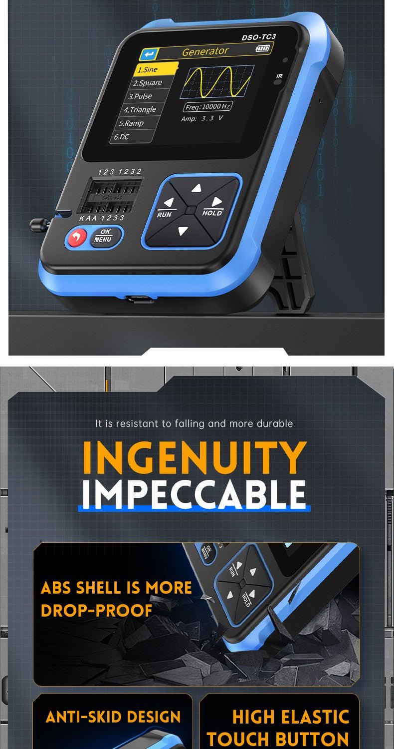 - 3-IN-1 Integration: digital storage oscilloscope, component tester, signal generator for beginners, hobbyist.