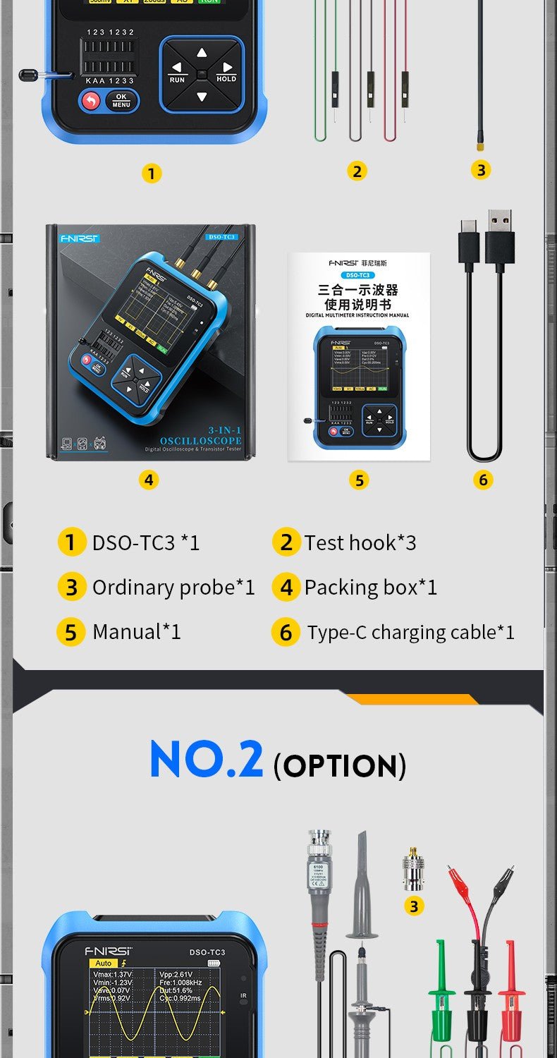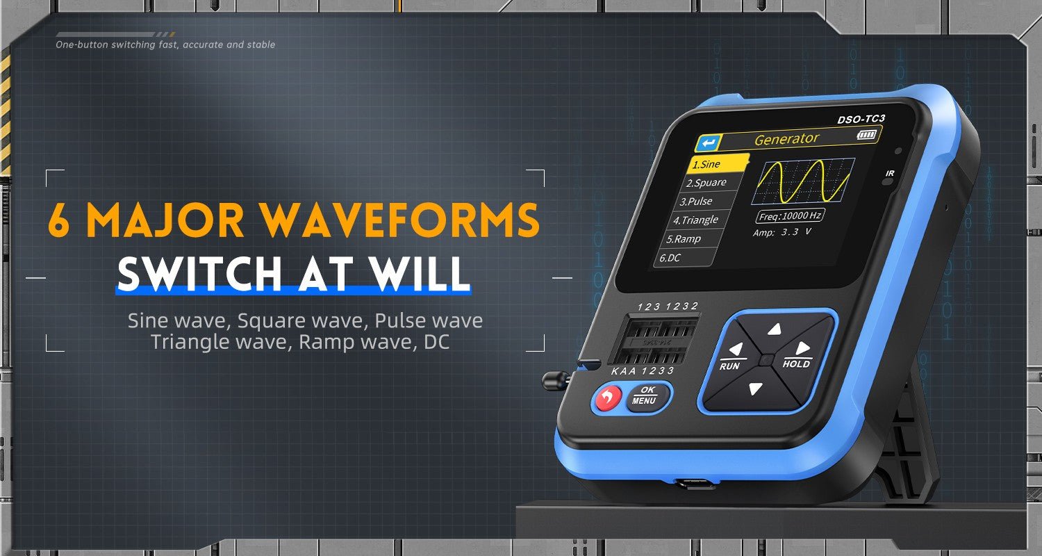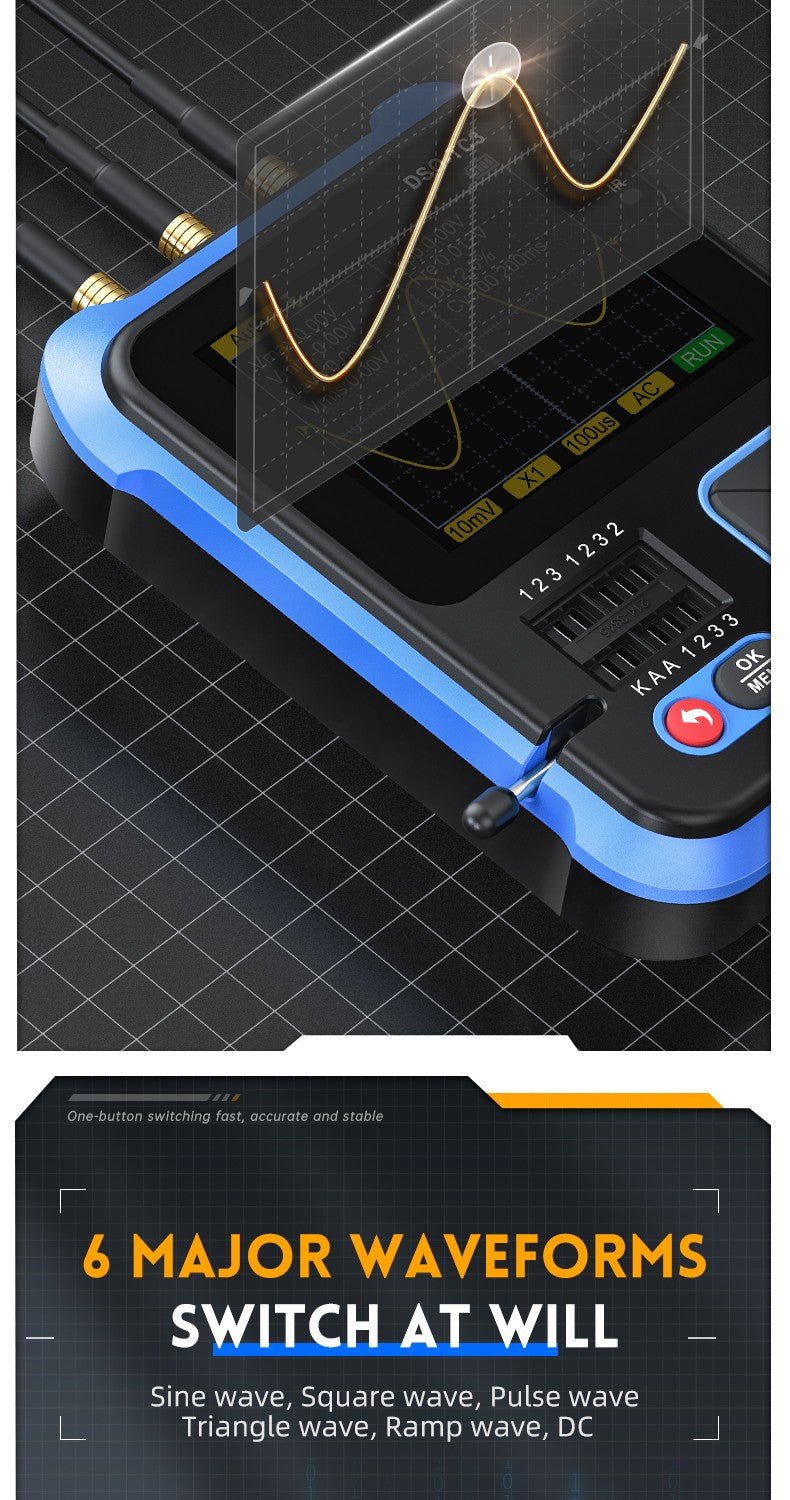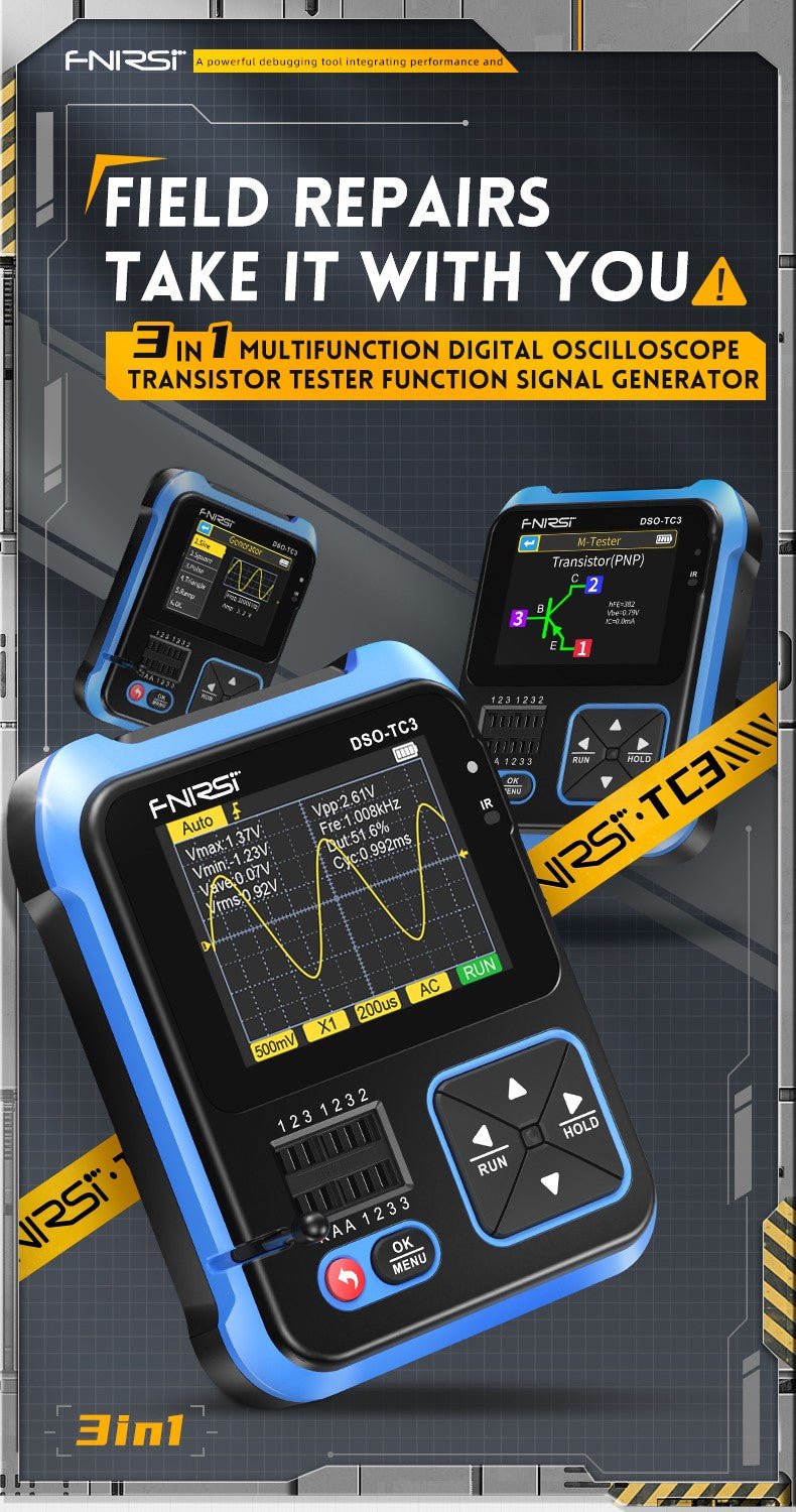 - 3-IN-1 Integration: digital storage oscilloscope, component tester, signal generator for beginners, hobbyist.