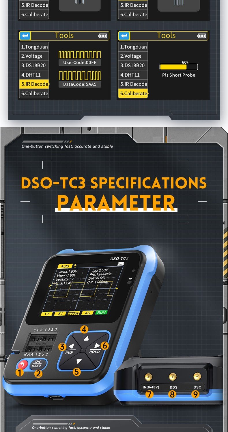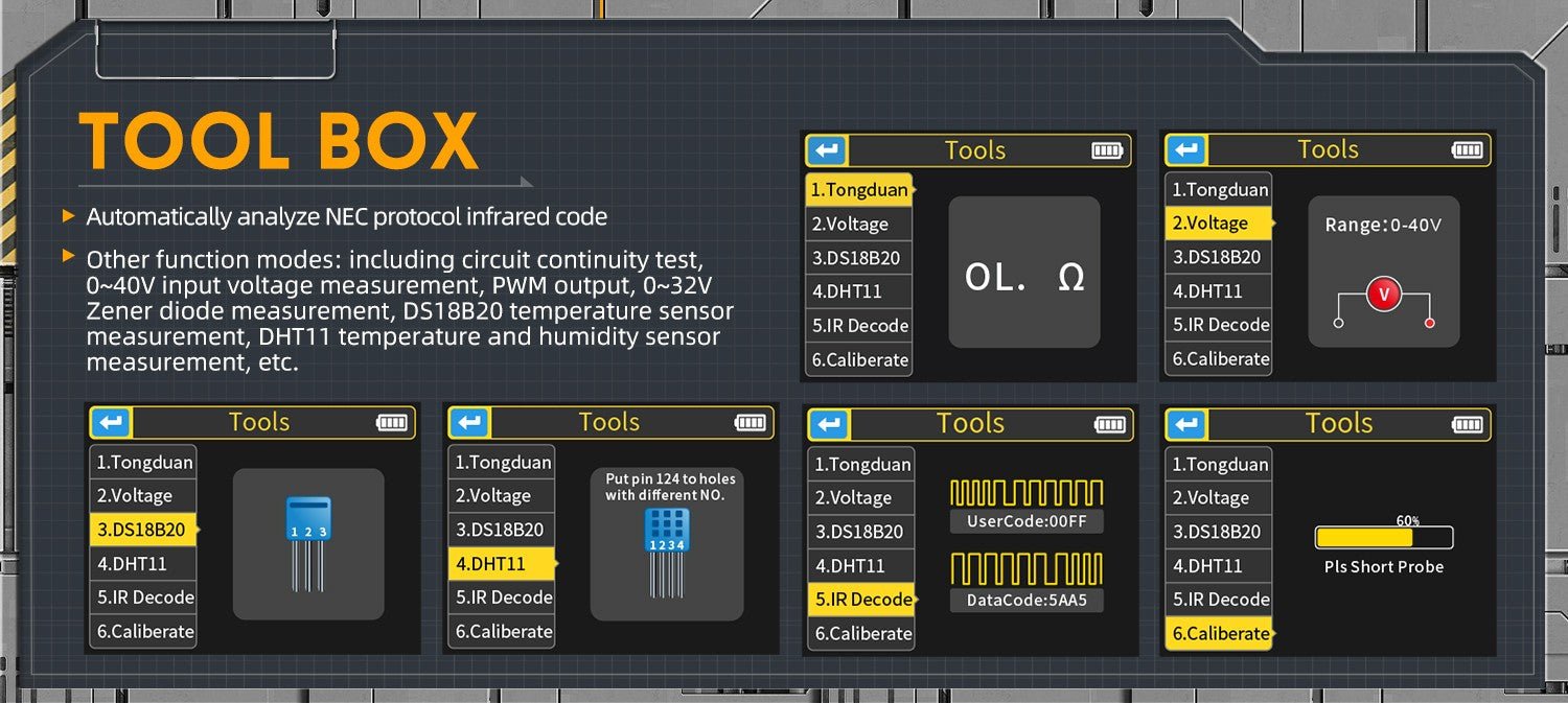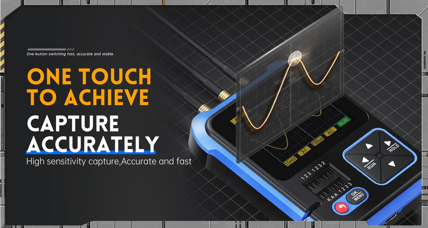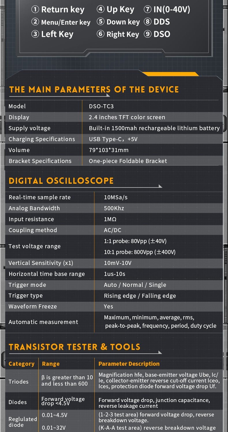 - 3-IN-1 Integration: digital storage oscilloscope, component tester, signal generator for beginners, hobbyist.