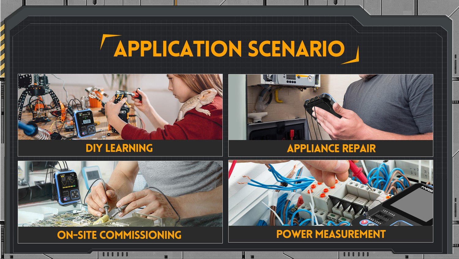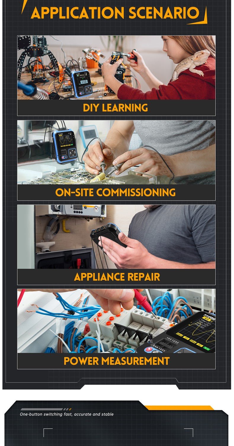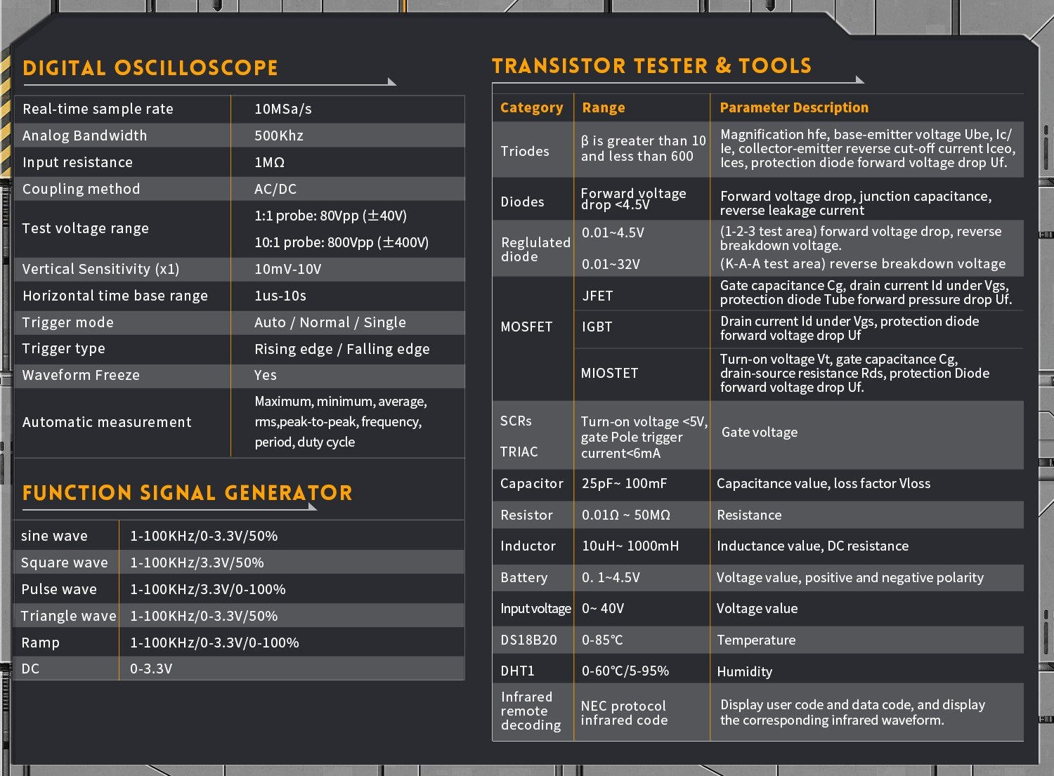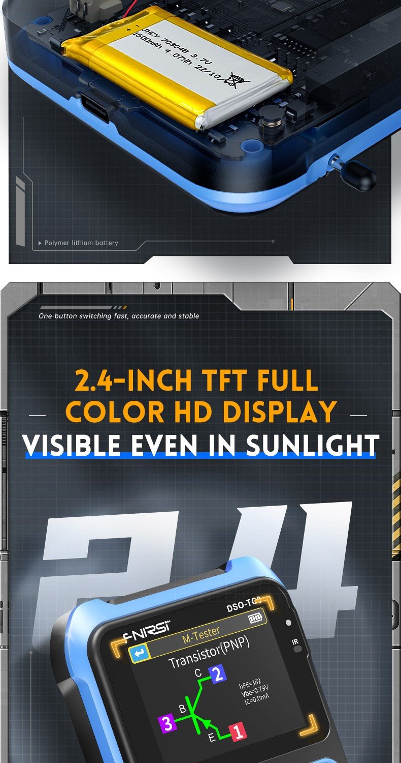 - 3-IN-1 Integration: digital storage oscilloscope, component tester, signal generator for beginners, hobbyist.